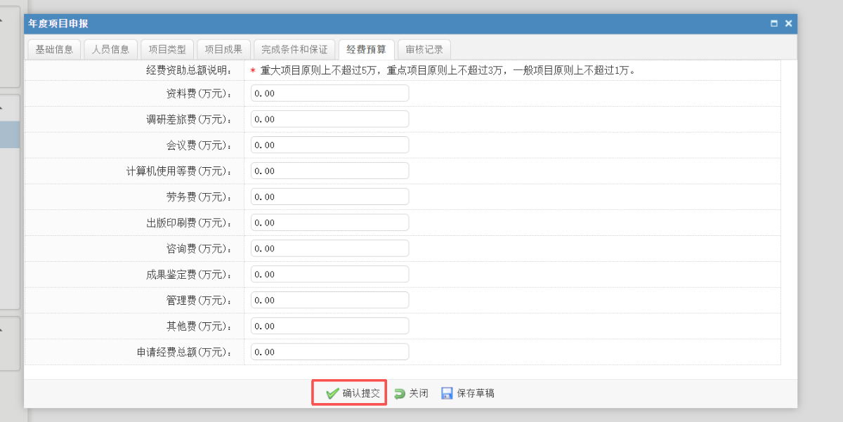 8.在经费预算选项卡中,根据成果具体情况填写预算,点击确认提交,即完成个人申报。