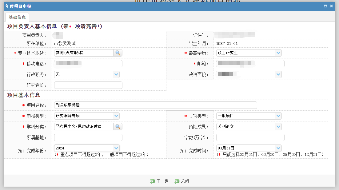 3.进入年度项目申报页面后,完善项目负责人基本信息,填写项目基本信息,项目名称填写刊发成果标题,申报类型选择“研究阐释专项”,立项类型根据成果发表刊物选择“一般项目”或“重点项目”“重大项目”,预期成果选择“系列论文”,预计完成时间默认,点击下一步。