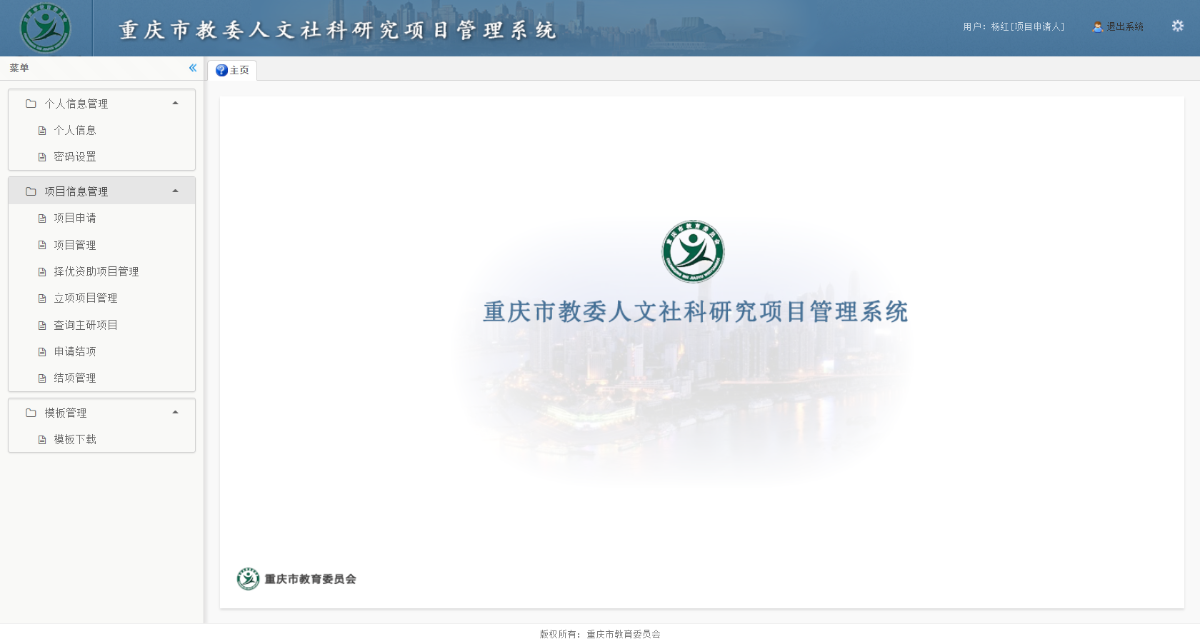 1.登录市教委人文社科研究项目管理系统后,点击左侧“项目申请”。