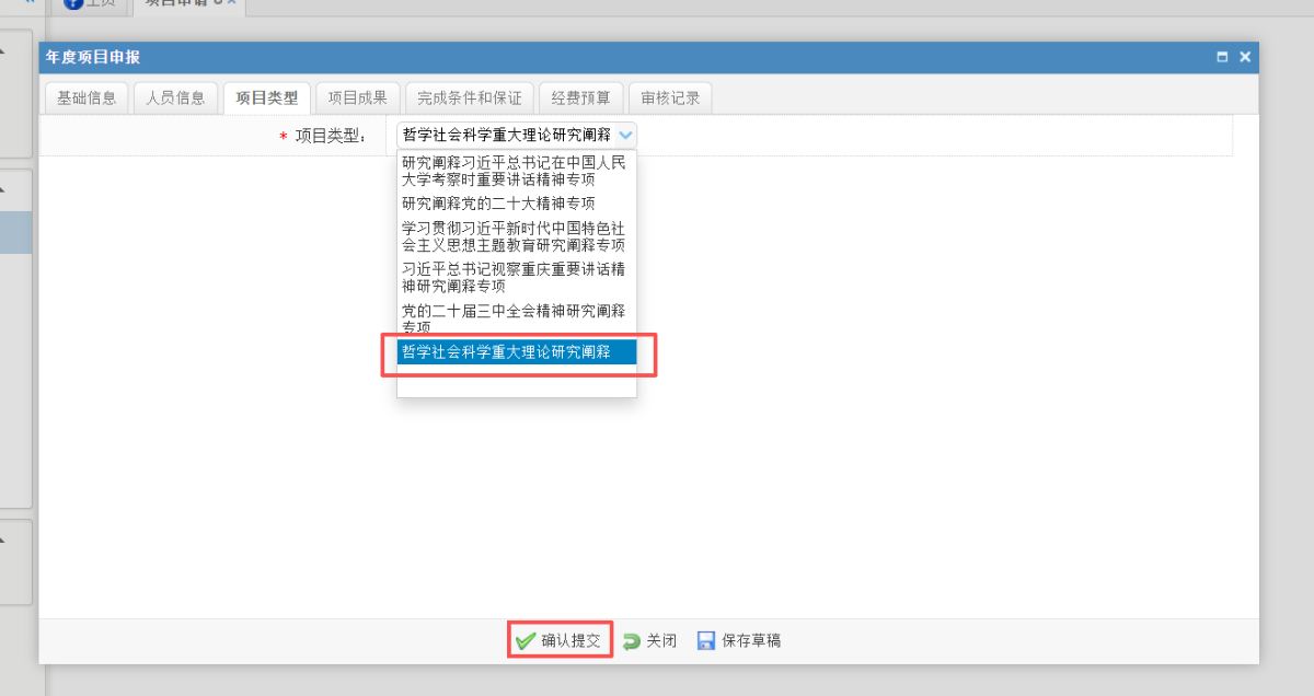5.在项目类型选项卡中,选择“哲学社会科学重大理论研究阐释专项”。