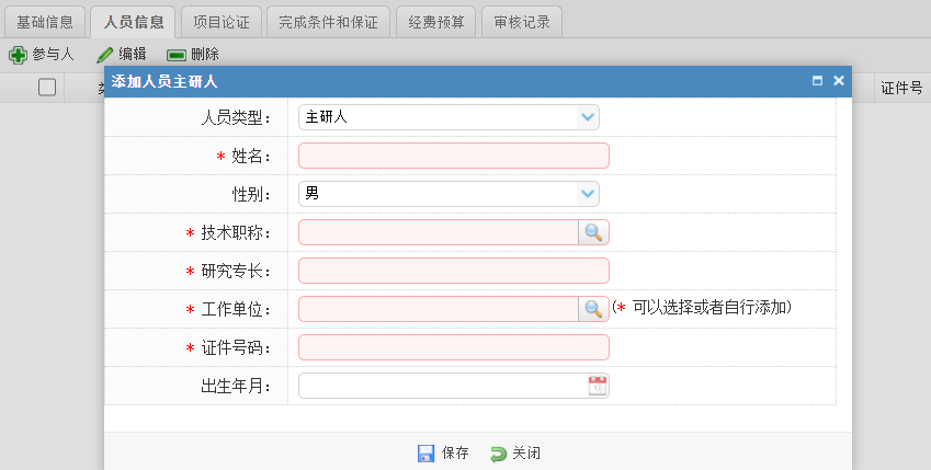 4.如刊发成果非独著,须添加主研人员信息,在人员信息选项卡中,点击“+参与人”,填写主研人员信息并保存。