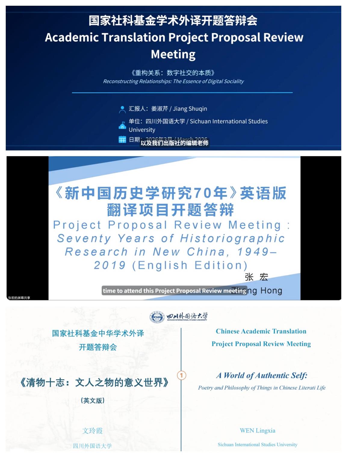 为扎实推进中华学术成果国际传播,高标准完成国家社科基金中华学术外译项目建设任务,四川外国语大学于2026年3月相继组织开展2025年度该项目两次开题答辩会。答辩分别采用线下集中评审与线上多元研讨形式,汇聚校内外权威专家与学术骨干,围绕史学、哲学、社会学、数字社交研究等多领域学术著作外译项目开展深度论证,为项目高质量实施筑牢基础,也标志着我校 2025 年度国家社科基金中华学术外译项目全面进入有序推进阶段。