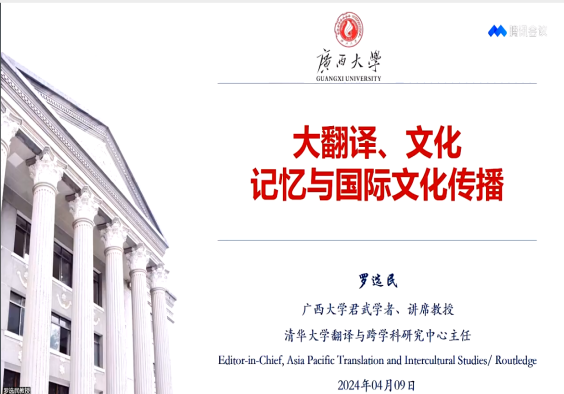 罗教授的讲座围绕发表于《外国语文》2024年第1期特稿专栏的“大翻译与文化记忆:融合与启示”一文展开,并广泛扩展了论文的内涵和外延,用大量实例解释了文中的理论概念,将平面的文字转换为立体、生动、趣味性强的试听盛宴,将理论的思辨融入个案的阐释中。具体而言,罗教授首先对“大翻译”的内涵与外延进行了详细阐发,继而从“莎士比亚”“塞万提斯”以及“汤显祖”三大家文本的传播与经典化为切入点,并结合本人在海内外的实际体悟,为听众提供了对“个体记忆/集体记忆”“集体记忆/文学经典”“交往记忆/文化记忆”等概念的具体所指,还生动地介绍了他本人与莎翁戏剧演绎、塞万提斯经典化、西南联大记忆、《鲁拜集》的文学与翻译之缘。罗教授以严谨的理论素养梳理了大翻译思想的流变性、交往性以及媒介性,同时以风趣的案例与丰厚的学识阐明了“文化记忆生成”与“文学翻译经典”的逻辑关联,为听众带来了一场既有理论思辨又有实践关照、既有人文情怀又有学术见解的文学翻译思想盛宴。